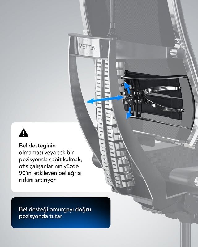 • Metta'nın sırtlık ve oturağının ergonomik şekli insan vücudunun anatomik şekline uygundur. Yükler, başlığın ve koltuğun yüzeyine eşit olarak dağıtılarak kas yorgunluğunu azaltır ve kan dolaşımını kolaylaştırır